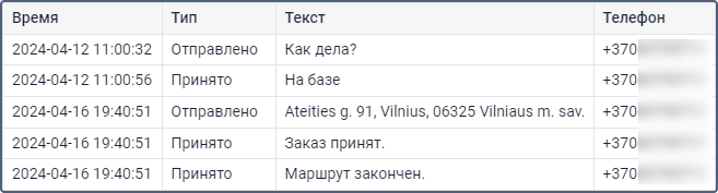 | Тип | Тип сообщения: отправлено (сообщение, отправленное оператором) либо получено (сообщение, полученное от водителя). |