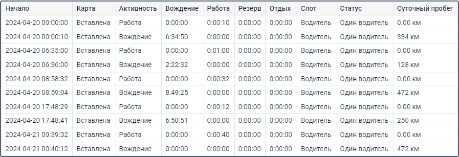 | Активность | Вид действия водителя (вождение, отдых, работа, резерв, перерыв). |
