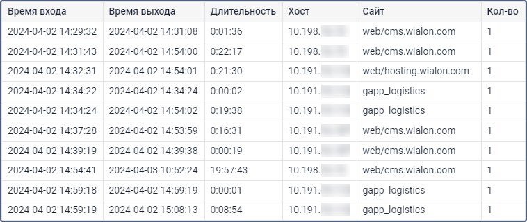 Таблица Логины показывает, куда и как часто заходил конкретный пользователь. Для содержимого таблицы могут быть выбраны столбцы, описанные ниже.