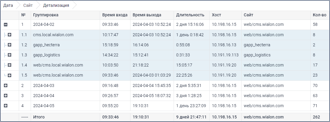 К таблице Логины могут быть применены те же настройки, что и к прочим таблицам: группировка, детализация, нумерация строк, итоговая строка, ограничение по времени. Ниже приведен отчет по пользователям с применением группировки по дням, детализацией, нумерацией и строкой Итого.