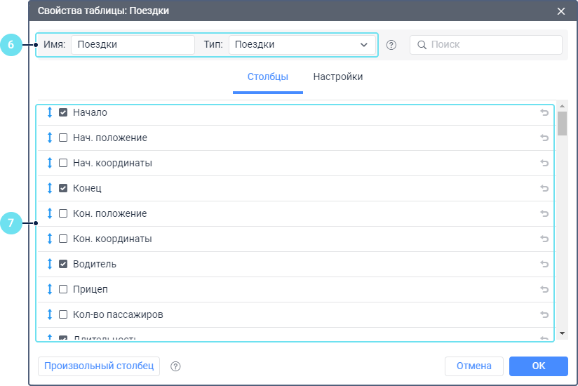7. Выберите столбцы, которые вы хотите увидеть в отчете. Вы можете менять их названия, а также создать произвольные столбцы. См. описание каждого столбца на странице нужной вами таблицы.