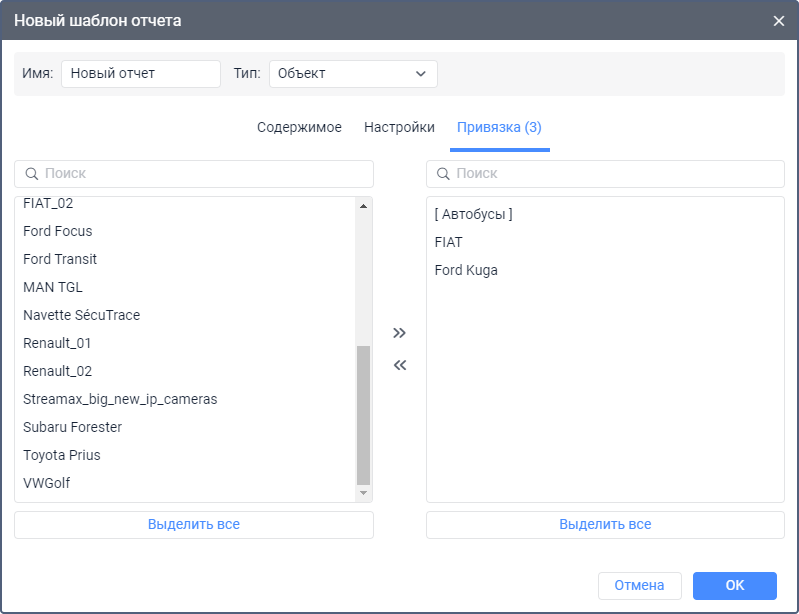 Шаблон отчета, в зависимости от своего типа, может быть привязан к конкретным элементам системы и их группам (для объектов, водителей, прицепов и пассажиров). Привязка позволяет ограничить список элементов, по которым выполняется отчет.