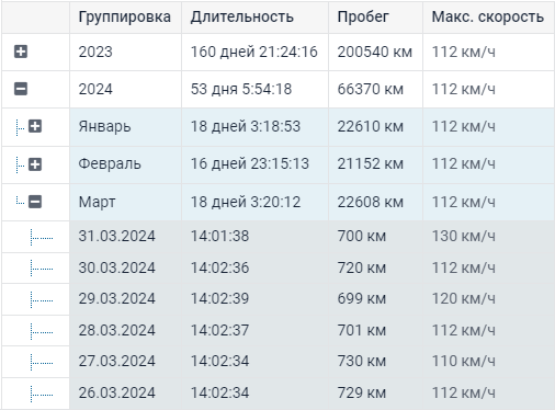 В этой таблице есть два дополнительных столбца по сравнению с той, для которой не заданы настройки группировки и сортировки. Первый — это столбец, содержащий кнопки + и -, которые помогают раскрывать/скрывать уровни вложенности. Второй — столбец Группировка, в котором показываются сами уровни. Информация в таблице сгруппирована по годам, а нажатием на плюс открываются последующие уровни группировки (месяцы, даты). Даты отсортированы по максимальной скорости (от большей к меньшей).