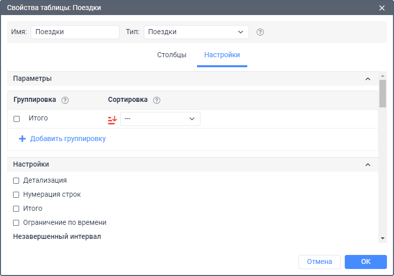 В зависимости от типа отчета, кроме стандартных группировок (по временным интервалам) могут быть доступны и дополнительные (например, по геозоне, маршруту, датчику, пользователю, событию, типу действия, типу нарушения, поездкам, улицам). В таком случае группировка работает по имени.