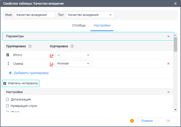 В секции Параметры можно настроить группировку и сортировку данных отчета, а также включить опцию Извлечь интервалы (если доступна).