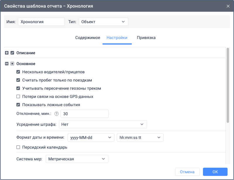 В разделе Основное можно настроить формат даты и времени, выбрать систему мер и разделитель групп разрядов, а также, в зависимости от типа отчета, активировать ряд других опций, описанных ниже.