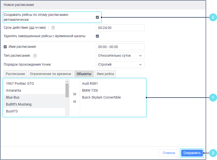 Впоследствии вы можете включать и выключать автоматическое создание рейсов с помощью иконки / рядом с именем расписания.Рейсы создаются автоматически, когда до запланированного времени прибытия в первую контрольную точку остается количество минут, указанное в поле отклонения. Если указано несколько объектов, то на рейс назначается тот, который первым покидает геозону начальной точки маршрута, независимо от выбранного порядка прохождения точек. |