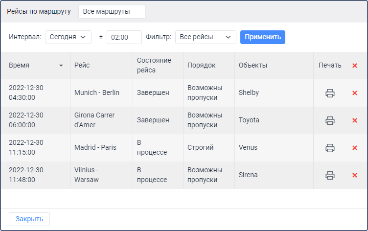 | Печать | Иконка для вывода рейса на печать. Информация для печати представляет собой сводку из двух таблиц. В первой находится информация о рейсе (имя, описание, состояние, объекты, время активации, имя маршрута и расписание), во второй — о его точках (порядковый номер, адрес, время прибытия и, если активировано в расписании, отправления). |