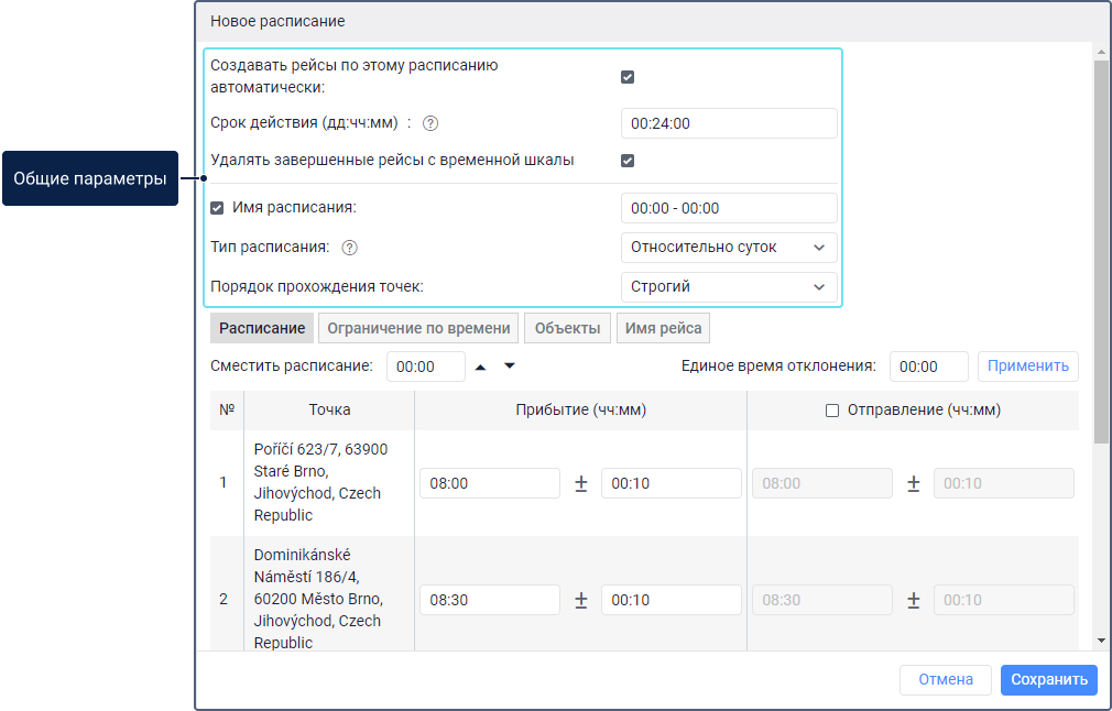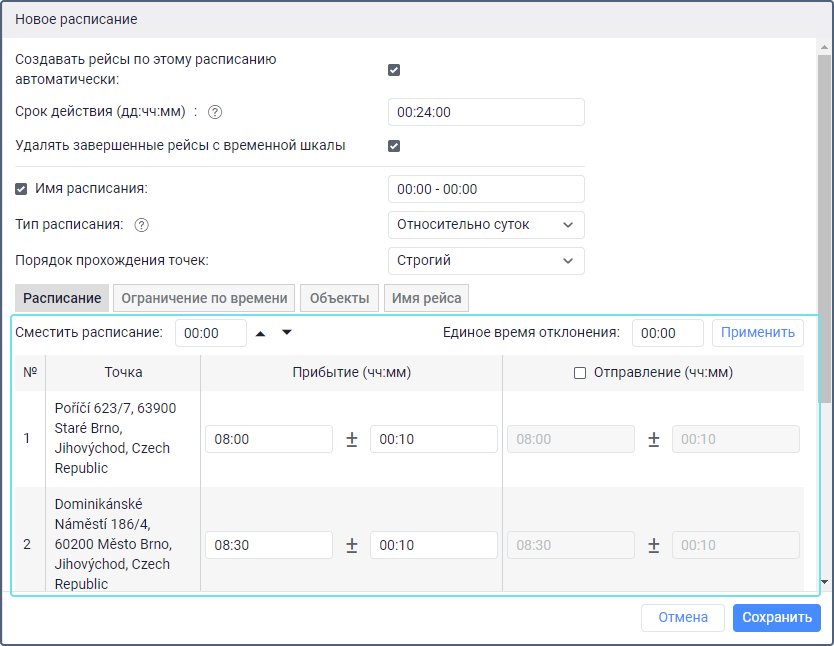 Чтобы установить одинаковое отклонение от времени прибытия и отправления для всех контрольных точек сразу, заполните поле Единое время отклонения и нажмите на Применить.