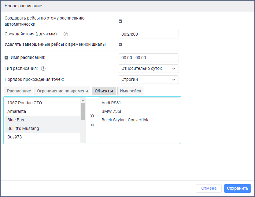 На вкладке Объекты выберите объекты, которые должны назначаться на рейсы по этому расписанию, если включено автоматическое создание рейсов.