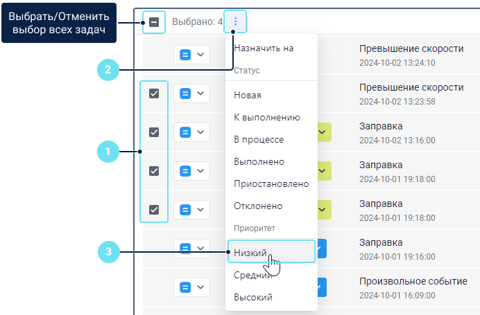 После регистрации события задача появляется в списке задач со статусом Новая. Вы можете изменить статус одной задачи или нескольких задач сразу.