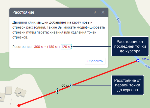 Если вы смещаете курсор мыши с последней точки, то на карте показывается сумма отрезков от первой точки до места расположения курсора, а в окне инструмента  —  сумма всех отрезков от первой до последней точки и расстояние от последней точки до курсора.