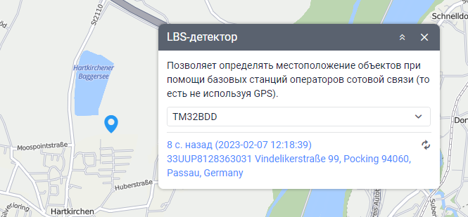 В окне LBS-детектора можно увидеть время, когда были получены данные о последнем местоположении, и его адрес. Также здесь доступна иконка