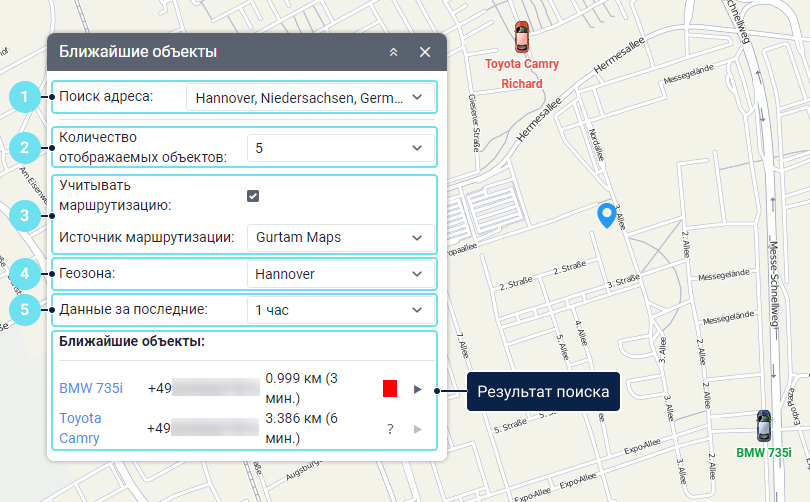 Этот инструмент позволяет находить на карте объекты, которые согласно их последним сообщениям находятся ближе всего к указанному вами местом. Искать можно только среди тех объектов, которые добавлены в рабочий список на вкладке Мониторинг.