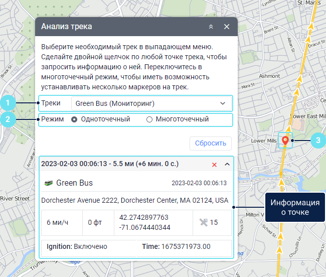- Выберите режим анализа трека: одноточечный или многоточечный. Многоточечный режим позволяет видеть в окне инструмента информацию о нескольких точках. В одноточечном при выборе новой точки удаляется информация о предыдущей.