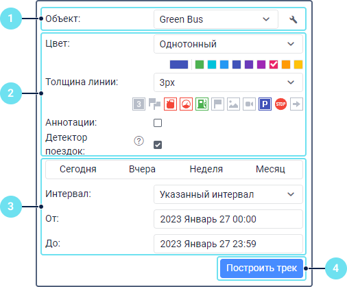 3. Укажите временной интервал, за который необходимо построить трек. Принцип выбора временнóго интервала такой же, как в отчетах.