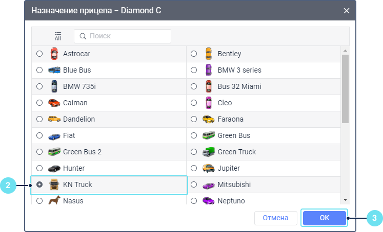 В открывшемся окне выберите объект, на который необходимо назначить прицеп. Здесь показываются объекты из рабочего списка на вкладке Мониторинг. Если в списке нет объектов, нажмите на иконку
