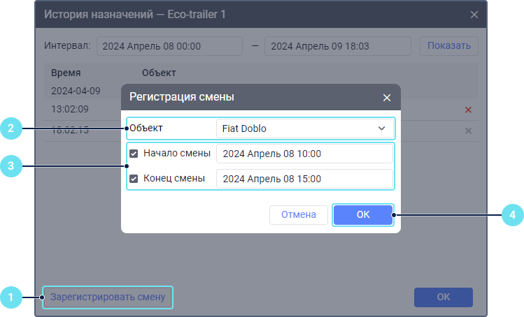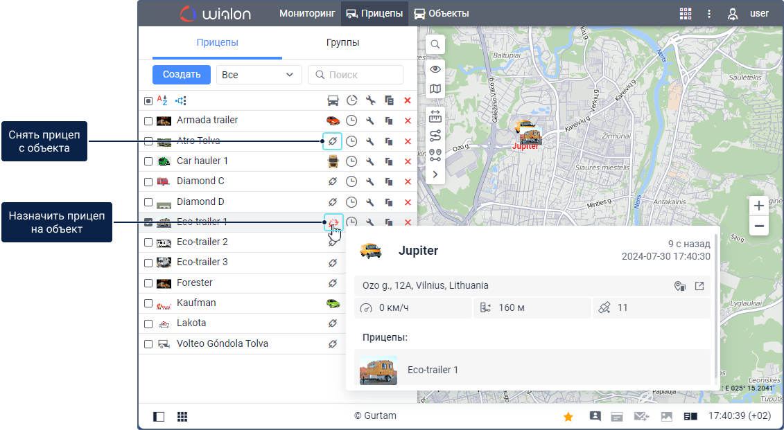 Назначить и снять прицеп с объекта можно вручную или автоматически. После этого можно работать с историей назначений.