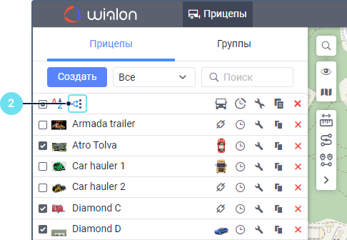 напротив необходимого прицепа в списке прицепов или их групп. Если у вас нет права доступа Создание, редактирование и удаление прицепов на ресурс, то иконка неактивна (