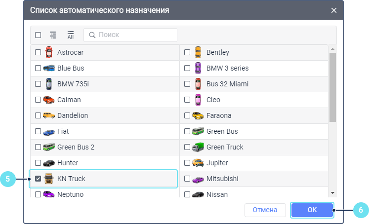 Отметьте объекты или группы объектов, на которые водители выбранного ресурса должны назначаться автоматически. Для переключения между списками объектов и их групп используйте иконку