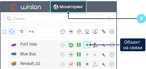 Перейдите на вкладку Мониторинг, куда автоматически добавляются созданные объекты. Удостоверьтесь, что объект подключен и отправляет сообщения в систему. В этом случае в списке в столбце Состояние соединения для него показывается зеленый маркер.