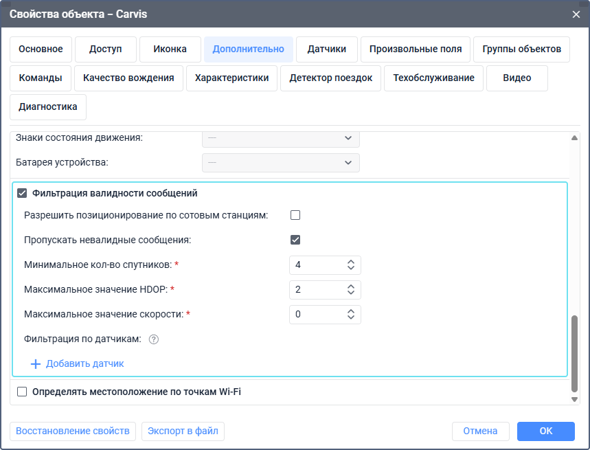 Для решения этой проблемы в Wialon предусмотрена фильтрация валидности сообщений. Эта функция позволяет вам указать критерии, которые определяют, является ли сообщение валидным. Если сообщение невалидно, оно сохраняется в базе данных без информации, полученной по GPS: то есть без скорости, координат, количества спутников, высоты и направления движения. Другие данные из такого сообщения (например, значения датчиков) сохраняются и могут использоваться в системе.