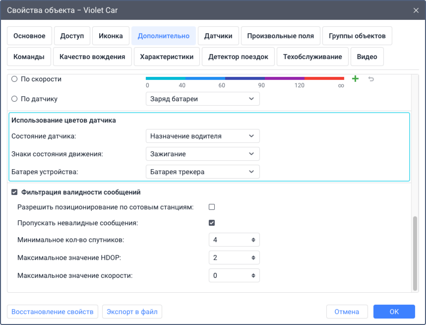 | Максимальное значение скорости | В этом поле вы можете указать ограничение для значений скорости, при условии превышения которого сообщение считается невалидным. Нельзя указать значение больше 9999. Если указан 0, то этот критерий фильтрации не учитывается. |