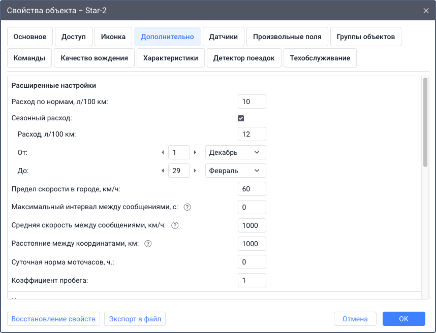 | Сезонный расход | Опция, с помощью которой вы можете указать отдельную норму расхода топлива для определенного периода. Значение по умолчанию — 0.Если опция Сезонный расход включена, то при создании нового датчика с помощью мастера расхода по расчету опция Сезонный коэффициент, % в нем активируется по умолчанию. При этом значение коэффициента рассчитывается в соответствии со значениями, указанными на вкладке Дополнительно. |