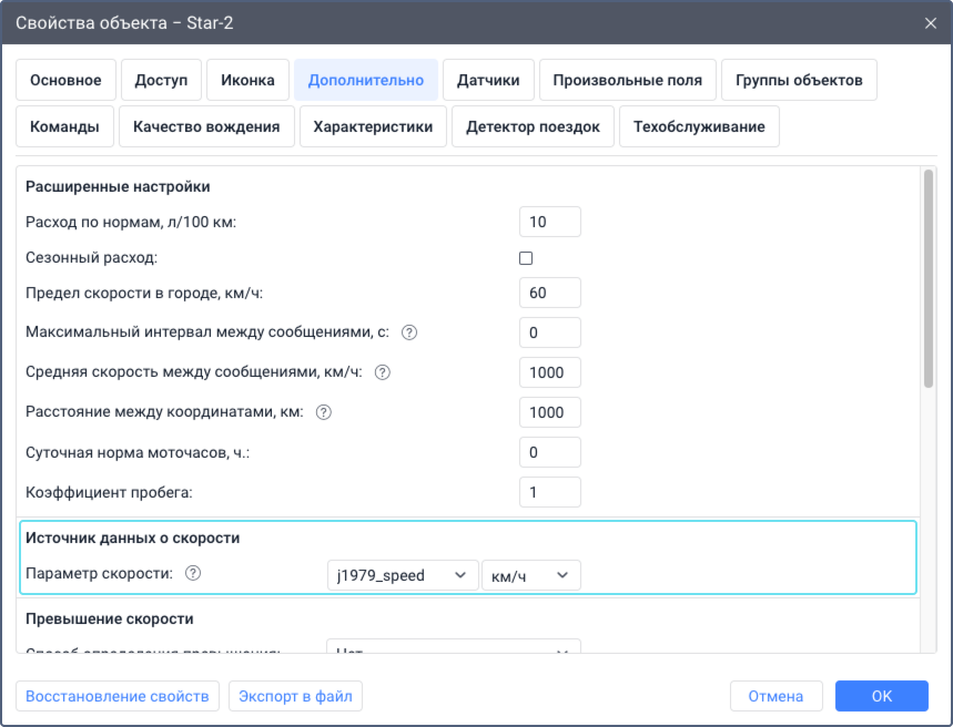В большинстве случаев в системе мониторинга в качестве значений скорости используются значения, рассчитанные устройством по GPS. Они сохраняются в сообщениях объекта в параметре speed. Если они некорректны, вы можете указать параметр, значения которого должны подставляться в параметр speed.
