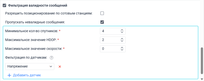 | Фильтрация по датчикам | Здесь вы можете добавить датчики, которые должны использоваться для фильтрации сообщений. Если значение выбранного датчика равно 0, сообщение считается невалидным. Чтобы добавить датчик, нажмите на Добавить датчик и выберите из списка необходимый. Можно добавить несколько датчиков. |