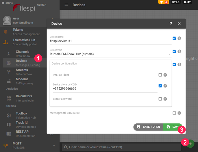 - Создайте устройство (Device) на flespi. Для этого в телематическом хабе (Telematics Hub) откройте вкладку Devices, нажмите на кнопку