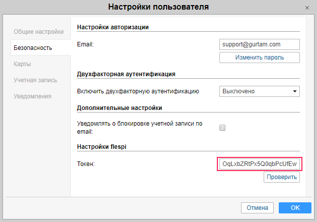 - В Wialon вставьте скопированный flespi-токен в поле Токен на вкладке Безопасность настроек пользователя верхнего уровня.