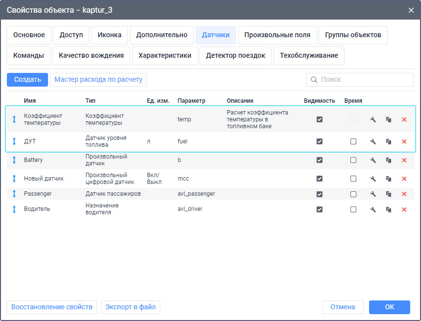 Любая жидкость может сжиматься или расширяться при разной температуре, поэтому показания датчика уровня топлива могут быть недостаточно точными без учета температуры в топливном баке или, например, в цистерне. В таком случае, для получения более точных вычислений уровня топлива необходимо также создать датчик типа Коэффициент температуры. Он позволяет рассчитать коэффициент температуры на основе параметра, в котором приходят данные о температуре или напряжении.