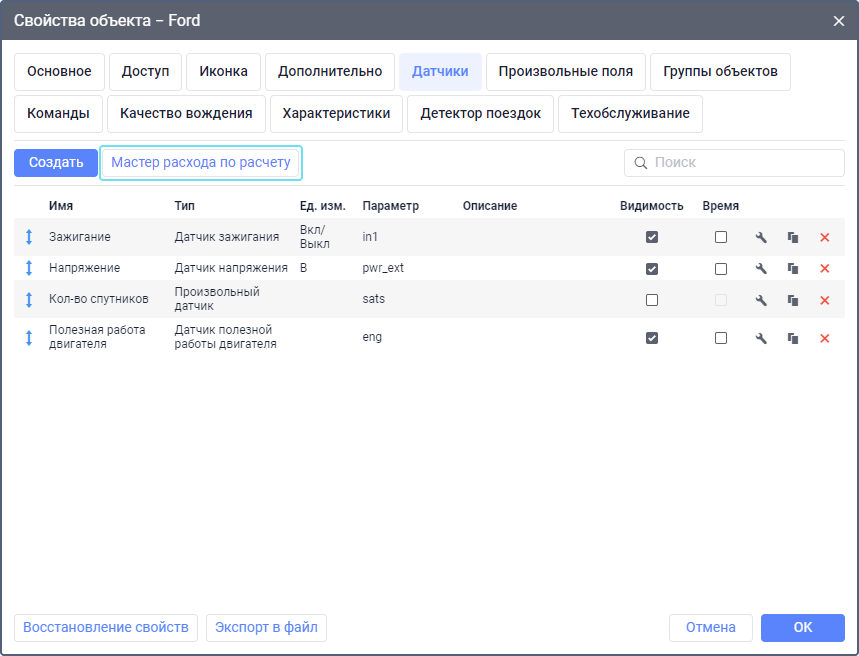 Чтобы открыть мастер расхода по расчету, нажмите на одноименную кнопку на вкладке Датчики свойств объекта.