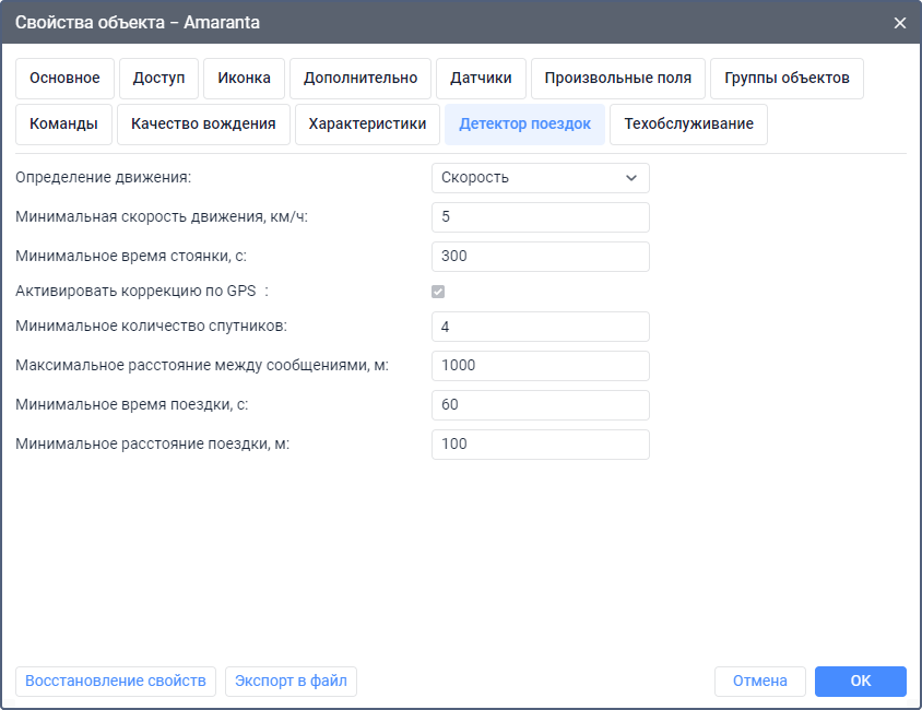 • Чтобы получить более корректные данные в отчетах по уже зафиксированным в базе сообщениям, попробуйте настроить иначе детектор поездок объекта. В частности, уменьшите максимальное расстояние между сообщениями и увеличьте минимальное количество спутников.