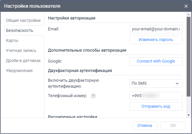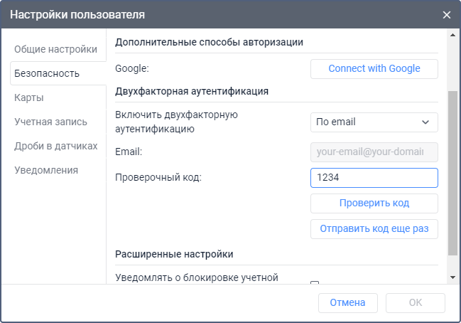 На вкладке Безопасность можно настроить авторизацию и включить двухфакторную аутентификацию.