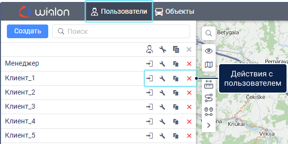 Действия на вкладке «Пользователи»