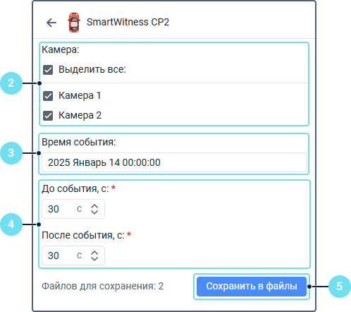 - Нажмите на кнопку Сохранить в файлы. Кнопка неактивна, если на сохраняемом промежутке нет данных ни с одной камеры.