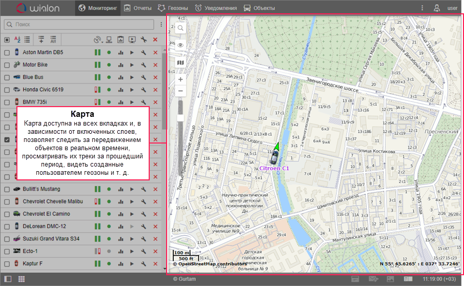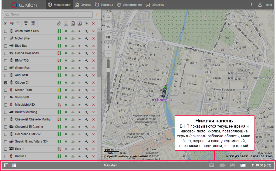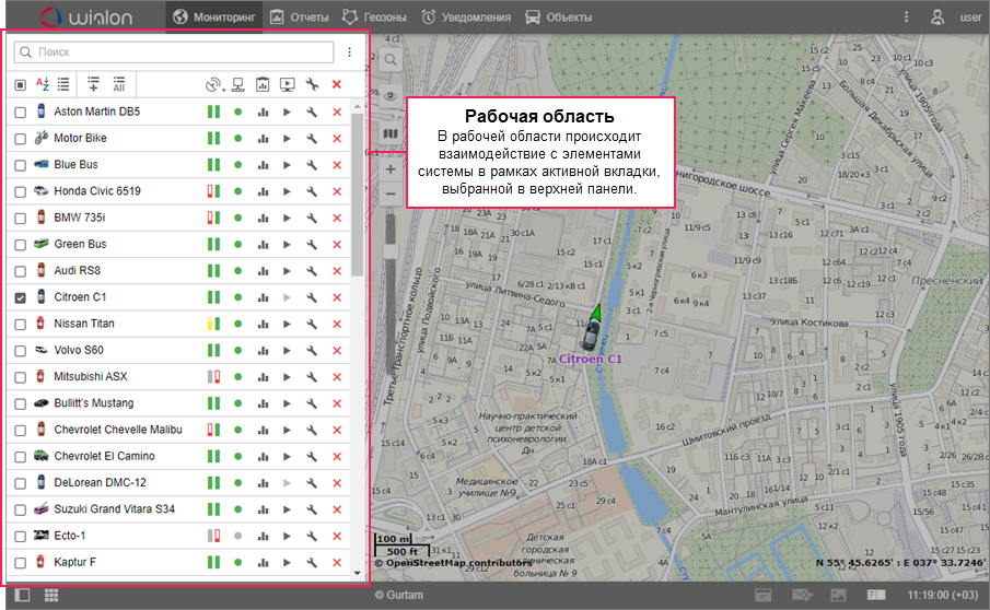 Основные элементы интерфейса системы мониторинга показаны ниже.