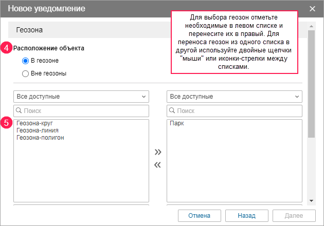 Выберите тип контроля В геозоне (уведомление срабатывает внутри геозоны).