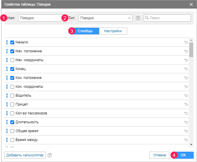 - Отметьте необходимые столбцы (3). В примере: Начало, Нач. положение, Конец, Кон. положение, Длительность.