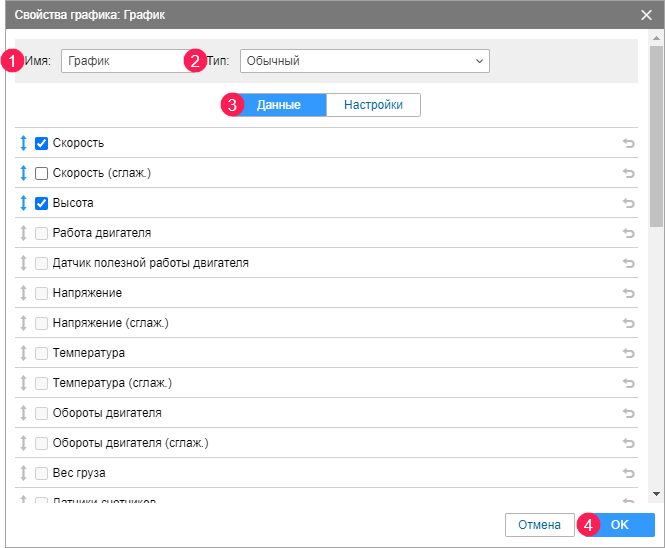 - Отметьте, какие данные (кривые) должны отображаться на графике (3). В примере: Скорость и Высота.