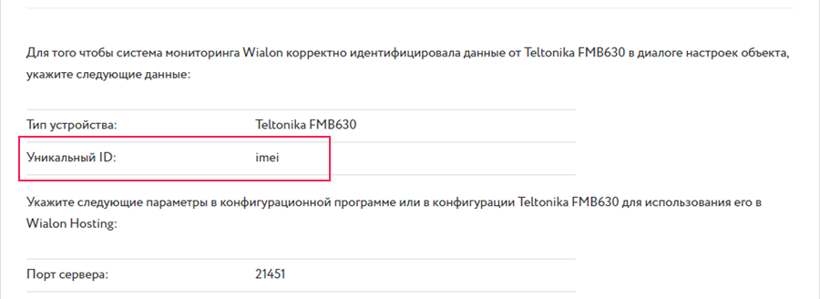 Для того чтобы определить, что выступает в качестве идентификатора интересующего вас устройства, найдите его в списке в разделе GPS-оборудование на нашем сайте. Для каждого устройства, совместимого с Wialon, такая информация указана в поле Уникальный ID. В качестве уникального ID оборудования может использоваться его IMEI, серийный номер или заданное пользователем произвольное числовое значение (custom). Так, например, для трекера Teltonika FMB630 доступна следующая информация: