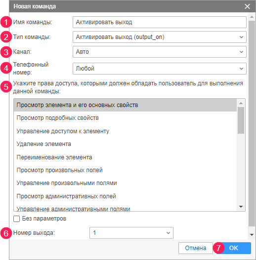 - Укажите следующее: имя команды (1); тип команды (2); канал (тип связи) (3); телефонный номер, на который ее следует отправлять (4); права доступа, необходимые пользователю для выполнения команды (5); номер выхода, который следует активировать (6).