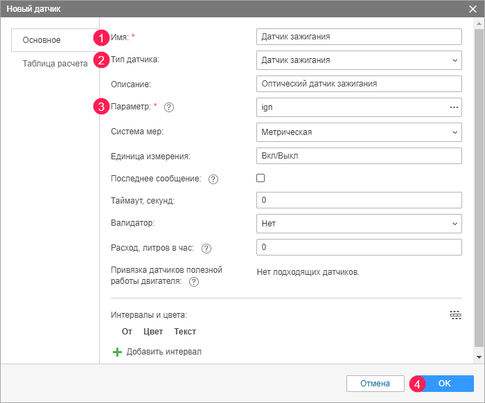 На вкладке Датчики свойств объекта можно создавать, редактировать и удалять датчики. В качестве примера создадим датчик типа Датчик зажигания, который используется при определении поездок и стоянок, а также в счетчиках пробега и моточасов.