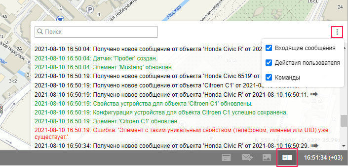 Помимо входящих сообщений от объектов, в журнале также показываются действия пользователя (создание, редактирование и удаление элементов и т. д.) и команды, отправленные на объекты.