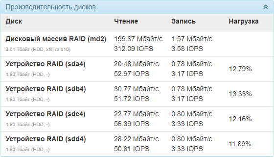 В этом блоке представлены данные об интенсивности чтения и записи и о нагрузке на жесткие диски, на которых расположена база данных Wialon Local.