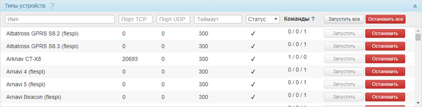 | Команды | В этом столбце показывается количество команд, доступных для устройств этого типа и передаваемых по каналам TCP, UDP и Virtual. Во всплывающей подсказке содержится подробная информация с именами всех команд для каждого канала. |