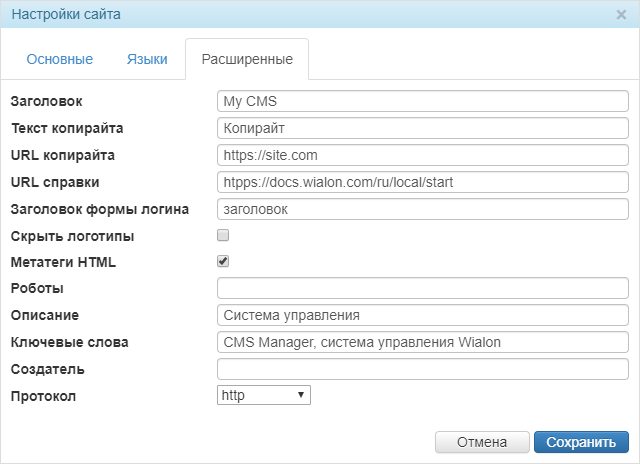 В расширенных настройках сайта CMS Manager доступны описанные ниже параметры.