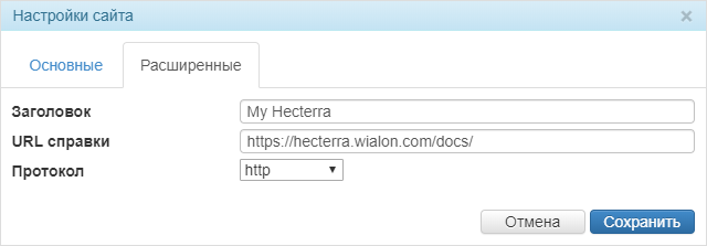 | Протокол | Для работы сайта Hecterra по протоколу https необходимо, чтобы по https также работал сайт (Wialon Web или CMS Manager), указанный в поле Базовый URL-адрес на вкладке Основные (т. е. в поле Протокол для него должно быть выбрано http+https или https). |